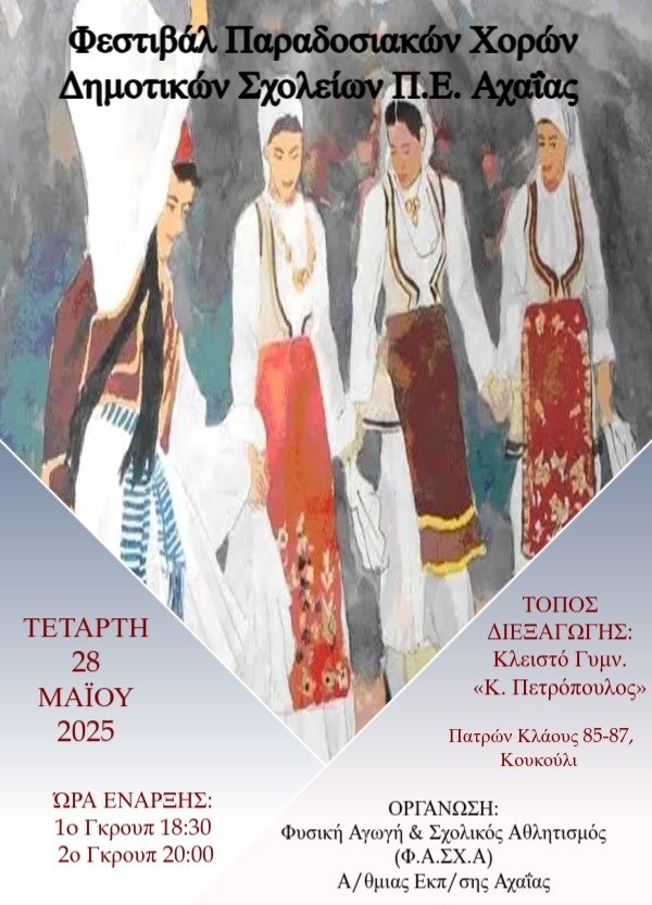Με την συμμετοχή πάνω από διακόσια πενήντα (250) μαθητών/τριών από δεκαπέντε (15) Δημοτικά Σχολεία της Αχαΐας (1ο και 3ο Αιγίου, 6ο, 19ο, 21ο, 32ο, 33ο, 34ο, 39ο, 41ο, 46ο και 48ο Πατρών, Καρυάς, Λάππα και των Εκπαιδευτηρίων Αναγέννηση) πραγματοποιήθηκε την Τετάρτη 28-05-2025 στο Κλειστό Γυμναστήριο «Κ. Πετρόπουλος» στο Κουκούλι το ετήσιο Φεστιβάλ Παραδοσιακών Χορών των Δημοτικών Σχολείων Αχαΐας που διοργάνωσε το τμήμα Φυσικής Αγωγής & Σχολικού Αθλητισμού της Πρωτοβάθμιας Εκπαίδευσης Αχαΐας.