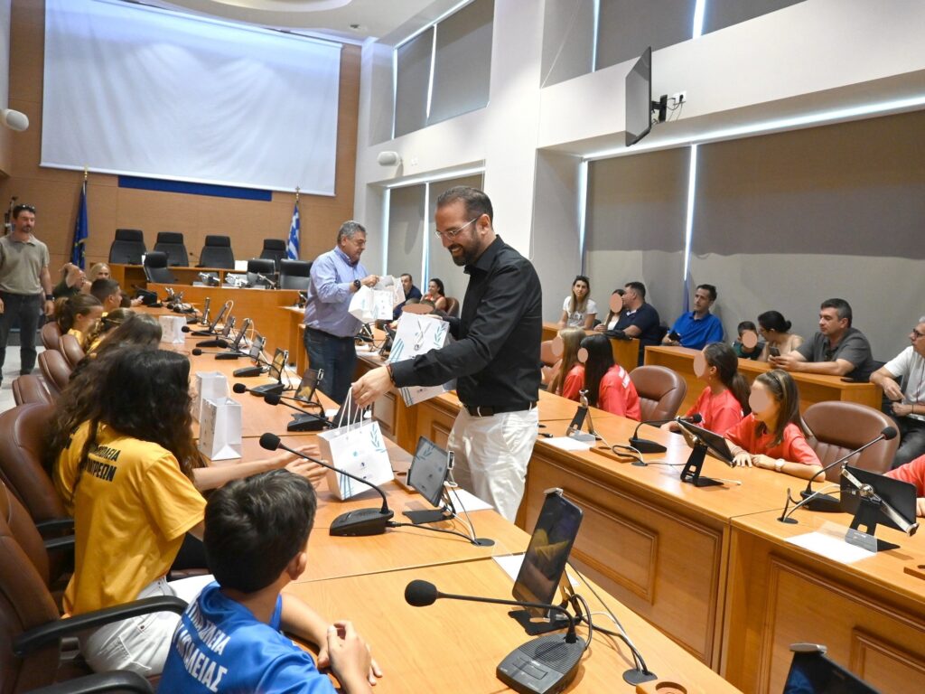 Τους μαθητές και τις μαθήτριες της Πρωτοβάθμιας Εκπαίδευσης Αχαΐας που συμμετείχαν στους τελικούς αγώνες της Γ΄ Φάσης του προγράμματος «Παιδικοί Ολυμπιακοί Αγώνες», που πραγματοποιήθηκαν στις 16-05-2025 στις εγκαταστάσεις της Διεθνούς Ολυμπιακής Ακαδημίας στην Αρχαία Ολυμπία, υποδέχτηκαν την Τρίτη 17-06-2025 ο Περιφερειάρχης Δυτικής Ελλάδας, κ. Νεκτάριος Φαρμάκης, και ο Αντιπεριφερειάρχης Αθλητισμού, κ. Παναγιώτης (Τάκης) Αντωνόπουλος, στην αίθουσα συνεδριάσεων του Περιφερειακού Συμβουλίου, παρουσία αντιπροσωπείας των Εκπαιδευτικών Φυσικής Αγωγής που είχαν συνοδεύσει την αποστολή των μαθητών/τριών στην Αρχαία Ολυμπία (Μαρία Παππά, Βασίλειος Σουβαλιώτης, Αναστάσιος Μιχαηλίδης) και των γονέων των μαθητών/τριών.