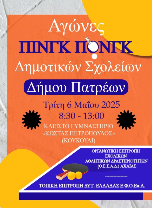 Με την συμμετοχή εκατόν είκοσι (120) περίπου μαθητών/τριών από δεκαέξι (16) Δημοτικά Σχολεία του Δήμου Πατρέων (2ο Δ.Σ. Παραλίας Πατρών, 4ο, 5ο, 12ο, 21ο, 24ο, 25ο, 29ο, 42ο, 44ο, 48ο, 56ο και 64ο Δ.Σ. Πατρών, Δ.Σ. Αγίου Βασιλείου, Κάτω Καστριτσίου και Ροϊτίκων) ολοκληρώθηκαν την Τρίτη 06-05-2025 οι αγώνες Επιτραπέζιας Αντισφαίρισης (Πινγκ-Πονγκ) (ΑθλοΠΑΙΔΕΙΑΣ) Δημοτικών Σχολείων του Δήμου Πατρέων που διοργάνωσε η Οργανωτική Επιτροπή Σχολικών Αθλητικών Δραστηριοτήτων (Ο.Ε.Σ.Α.Δ.) Αχαΐας, δια μέσου της Φυσικής Αγωγής & Σχολικού Αθλητισμού της Πρωτοβάθμιας Εκπαίδευσης Αχαΐας, σε συνεργασία με την Τοπική Επιτροπή Δυτικής Ελλάδας Ε.Φ.Ο.Επ.Α, δια μέσου της τεχνικής συμβούλου της Ομοσπονδίας, κ. Κατερίνας Βασιλογάμβρου και του ομοσπονδιακού προπονητή, κ. Σωτήριου Ζήκου, στο κλειστό Γυμναστήριο «Κ. Πετρόπουλος», ύστερα από την ευγενική παραχώρηση του από το Παμπελοποννησιακό Εθνικό Αθλητικό Κέντρο (ΠΕΑΚ) Πάτρας.